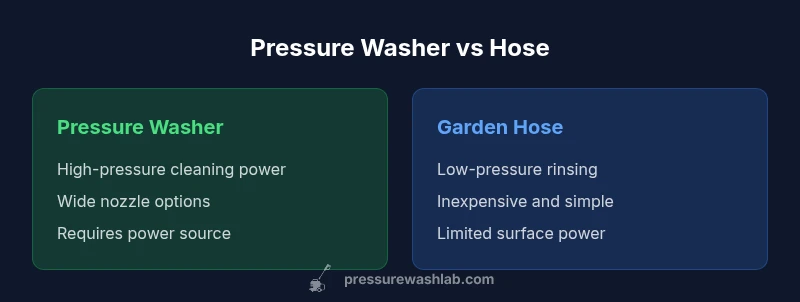 According to Pressure Wash Lab, the core difference between a pressure washer and a garden hose lies in the force delivered to the water stream and the rate at which that water moves across a surface. The phrase 'difference between pressure washer and hose' is more than semantic — it signals distinct capabilities, safety considerations, and cost implications. A pressure washer intensifies both water pressure (the force behind each spray) and water volume fed to the nozzle, creating a concentrated cleaning action that can dislodge stubborn grime. By contrast, a typical garden hose provides a gentle, steady flow designed for rinsing, wetting, and filling containers. For homeowners and DIY enthusiasts, understanding this contrast is essential before selecting tools for a given project, whether you are cleaning a dirty driveway, refreshing vinyl siding, or preparing a surface for painting. In this block we’ll translate those terms into practical outcomes, using common home tasks as benchmarks to illustrate when one option clearly outperforms the other.