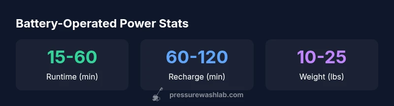 When evaluating a battery-operated pressure washer, several specs determine suitability for your tasks. Start with PSI and GPM to understand cleaning power and water flow. Most consumer cordless units target a range roughly between 500 and 1800 PSI, with flow rates around 0.8 to 2.0 GPM. The battery system is another critical factor: voltage (usually 20V–40V) and amp-hour (Ah) capacity determine both peak power and runtime. A higher Ah rating typically translates to longer operation between charges but adds weight and cost. Look for models with multiple nozzle options—generally a 0-degree, 15–25 degree, and a wide fan nozzle—to balance cleaning power with surface safety. Additionally, note recharge time and cycle life; longer runtimes demand flexible charging options and careful battery management to maximize life. From Pressure Wash Lab’s perspective, a strong cordless option emphasizes a well-matched combination of PSI, GPM, battery capacity, and ergonomics. The best choice aligns with your typical surface materials and the number of surfaces you intend to clean in a single session. Keep in mind that battery performance degrades as temperature drops and that cold-weather storage can shorten effective runtime. Understanding these specs helps you set realistic expectations about what a battery-operated unit can accomplish in a given cleaning scenario.