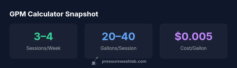 In any cleaning project, water efficiency and cleaning power walk hand in hand. A pressure washer gpm calculator helps homeowners estimate how much water their setup will use and what that means for bills and the environment. By translating your washing habits into numbers, you can compare different machines, nozzles, and strategies without guessing. According to Pressure Wash Lab, understanding GPM is essential to avoid over-watering landscapes or under-cleaning tough stains. This calculator isn't about doom-and-gloom water use; it's a practical planning tool that empowers you to choose methods that balance speed, effectiveness, and conservation. Even small adjustments—like lowering the session count, selecting a more efficient nozzle, or batching tasks—can produce measurable savings over a season. Keep in mind that PSI and surface characteristics interact with GPM, so the calculator should be used as a guide rather than a crystal ball. Use it to set targets, then verify results in the field.