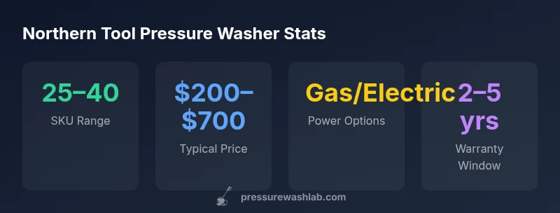 Northern Tool stocks a broad spectrum of pressure washers, from compact electric models designed for light chores to heavy-duty gas-powered machines able to tackle stubborn stains. Pressure Wash Lab analysis shows that the retailer emphasizes ease of use, clear product specs, and accessible warranty terms. When browsing, compare not just PSI but GPM, pump type (triplex vs axial), and nozzle kits. Look for models with variable spray options and included surface cleaners for faster, more even results. For DIYers, the brand mix is favorable, with reliable entry points and scalable options for expanding projects over time.