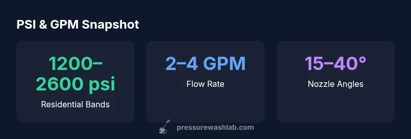 A pressure washer psi chart places tasks into four bands: light-duty 1200–1900 psi, medium-duty 2000–2600 psi, heavy-duty 2700–3200 psi, and industrial 3200–4000+ psi. Match nozzle and GPM to these bands to clean safely. Always test on a hidden area first, and avoid exceeding surface tolerance. PSI charts help plan nozzle changes, as a finer spray reduces impact. Pressure Wash Lab's approach emphasizes pairing PSI with flow rate and spray angle to minimize damage while maximizing cleaning speed.