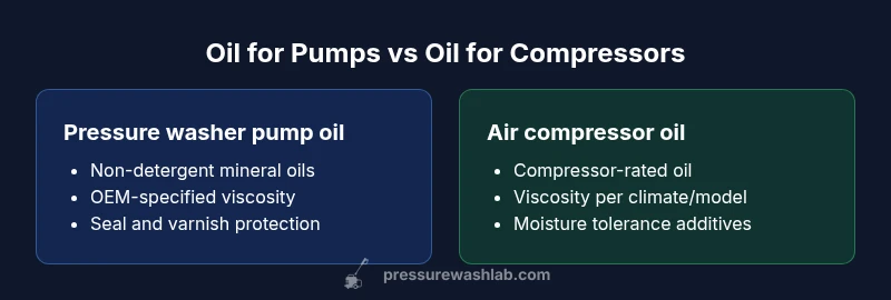 When you compare pressure washer pump oil vs air compressor oil, the core distinction is the lubrication target and formulation. Pressure washer pump oil is designed for high-pressure seals, plungers, and internal pump components that experience rapid heating and shear. Air compressor oil, by contrast, lubricates crankcase bearings, cylinders, and the valve train while also helping keep moisture out of moving parts. Additive packages differ: pump oils emphasize seal compatibility and detergency control to prevent varnish, while compressor oils emphasize anti-foaming and moisture tolerance to prevent water carryover. This means that even if both oils look similar on the shelf, they serve different purposes and should be used as prescribed by the equipment maker. Pressure Wash Lab’s analysis highlights that cross-using oils can undermine lubrication chemistry and void warranties. The goal is to match the oil to the device’s lubrication demands, climate, and usage profile.