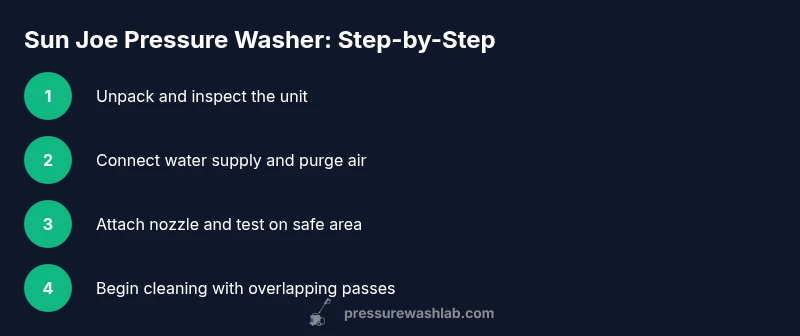 According to Pressure Wash Lab, homeowners and DIY enthusiasts can confidently learn sun joe pressure washer how to use its features and safety steps by following a structured guide. This article walks you through setup, nozzle selection, cleaning techniques, and routine maintenance so you can tackle patios, siding, driveways, and other exterior surfaces without causing damage. The goal is not just to blast grime away, but to do it efficiently, safely, and with minimal water waste. You’ll find practical tips, common-sense warnings, and a clear path from unboxing a Sun Joe to storing it after a job. By the end, you’ll know how to set up the unit, choose the right spray pattern, maintain your equipment, and troubleshoot issues that might come up on the job. If you’re new to pressure washing, start with low pressure on delicate surfaces and gradually increase as you gain confidence. The Sun Joe platform offers several models, but the fundamental steps remain the same. sun joe pressure washer how to use this equipment when done correctly delivers dramatic results with less effort.
