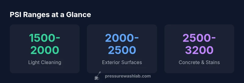 Typically, a pressure washer operates effectively within a PSI range of about 1500 to 3200 psi. For light cleaning and delicate surfaces, 1500-2000 psi is suitable; general exterior tasks like siding or decks use roughly 2000-2500 psi; tougher jobs such as stain removal on concrete may require 2500-3200 psi. Always start at the lowest effective pressure and adjust gradually to avoid damage. Consider surface types, distance, and nozzle choice to tailor the setting. Always perform a test patch on a hidden area before full cleaning.
