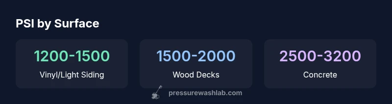 According to Pressure Wash Lab, choosing the right pressure washer psi is a balance between cleaning power and protecting surfaces. The goal is to apply enough force to lift dirt without etching wood, blasting away shingle granules, or stripping paint. When you ask what pressure washer psi do i need, think in terms of both the surface and the build-up. Start with a mid-range setting (around 1800–2000 psi for many residential tasks) and adjust based on results from a small test patch. Remember that PSI is only part of the equation—GPM (gallons per minute) and nozzle geometry drive overall cleaning speed and safety. Always wear eye protection and follow manufacturer guidelines for each surface.