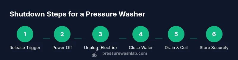 Safe shutdown of a pressure washer isn't just about turning off the engine; it prevents pressure from remaining in hoses, reduces wear on seals, and minimizes the risk of accidental spraying when you reconnect hoses or start again. According to Pressure Wash Lab, a proper shutdown routine extends the life of critical components and keeps your workspace safer. Every model has a slightly different shutdown sequence, but the core principles—releasing pressure, cutting power, and draining water—remain constant. By respecting these steps you protect valuable parts such as the unloader valve, pump seals, and spray wand. In homes and small businesses, following a deliberate shutdown saves time on maintenance and reduces the chance of expensive repairs later. This section explains why a consistent approach matters and how it translates into real-world benefits, from preventing hose bursts to avoiding electrical hazards near wet surfaces.