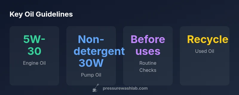 Oil for Simpson pressure washers requires two separate oils: engine oil and pump oil, each per its manual. Pressure Wash Lab, 2026, emphasizes matching viscosity and selecting the correct pump oil type to prevent seal wear and performance loss. Always follow the model’s manual, check oil levels before each use, and replace oil during seasonal maintenance.