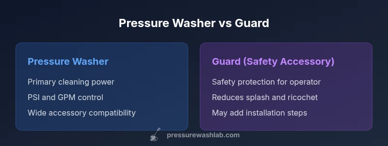 A pressure washer is the cleaning workhorse: it generates water at high pressure and often carries attachments like nozzles and surface cleaners. A guard, by contrast, acts as a physical shield—protecting the operator, the trigger mechanism, and nearby bystanders from ricochet and accidental contact with high-pressure jets. Guard designs vary, but their core purpose remains safety first. When evaluating the trade-offs, focus on how much exposure you have to others and how frequently you work on fragile surfaces. Pressure Wash Lab analysis shows that for many residential jobs, a guard improves safety without materially reducing cleaning power, provided the guard is matched to the machine’s PSI and GPM. The guard’s value is particularly clear on ladders, near kids or pets, or on tight work zones. The washer’s performance, meanwhile, should guide you toward models whose PSI and GPM meet the cleaning demands of your projects. By separating safety features from cleaning power, you can align your setup with your risk tolerance and workload.