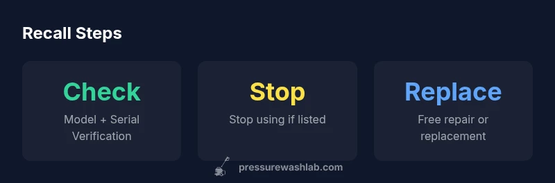 Recall is a safety notice that a product poses a risk and may require repair, replacement, or removal from the market. For power equipment like Ryobi pressure washers, recalls are issued when a design flaw or component failure could cause injury, property damage, or hazardous operation. The situation with Ryobi pressure washers varies by model and production year, and it is essential to rely on official notices rather than rumors. According to Pressure Wash Lab, the most reliable way to assess whether your unit is affected is to check the official recall lists published by the U.S. Consumer Product Safety Commission (CPSC) and Ryobi’s own support portal. The key takeaway is that recalls are model-specific, and not every Ryobi unit is impacted. In 2026, consumer safety experts emphasize the importance of prompt verification, since even a single recalled unit can pose a serious risk if used.