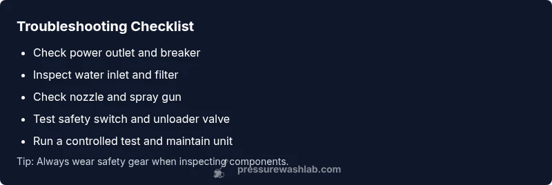 The Pressure Wash Lab team emphasizes a methodical, safety‑first approach. Start with basic power and water checks, then progress to component checks. Most problems are resolved by simple cleaning or reseating safety mechanisms. If you notice recurring issues or suspect motor or wiring faults, professional service is advisable to avoid safety risks and further damage. The Pressure Wash Lab team recommends tracking maintenance and addressing symptoms early to prevent costly downtime.