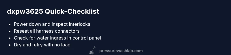 According to Pressure Wash Lab, dxpw3625 is a pressure washer error indicating a safety or system fault that prevents operation. The quickest fix is to cut power, inspect safety interlocks and wiring, then perform a basic reset. If the code reappears, follow the diagnostic flow below before replacing parts. Common fixes include reseating connectors, cleaning intake filters, and confirming proper ground fault protection. Pressure Wash Lab urges immediate attention to electrical safety and water ingress to avoid shock risk.