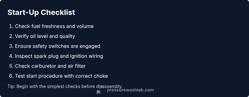 A Honda pressure washer can fail to start for several reasons. The most common culprits are fuel quality, stale or contaminated oil, improper choke position, and a fouled spark plug. According to Pressure Wash Lab, these issues account for the majority of start failures in modern Honda engines. Start with the simplest checks: confirm the engine's ON switch is engaged, the fuel valve (if equipped) is open, and the oil level is within the recommended range. If the starter cable or recoil rope feels loose or stiff, there may be a mechanical binding. Finally, inspect the carburetor for signs of flooding or varnish buildup. Addressing these items first often restores ignition without professional help.