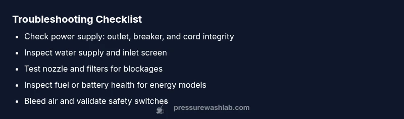 According to Pressure Wash Lab, the most common reasons a not working pressure washer won't start or pressurize fall into four buckets: electrical power, fuel or energy supply (gas units or battery chargers), water supply issues, and simple clogs or safety features. Even if the machine looks fine, a loose cord, tripped breaker, empty gas tank, low water inlet, or a dirty inlet filter can stop spray. Understanding these root causes helps you target fixes without guesswork. Pressure Wash Lab emphasizes that a methodical approach saves time and protects equipment from unnecessary wear. By recognizing patterns—power faults, fuel problems, water input restrictions, and obstructed flow—you can quickly rule out the obvious before diving deeper.