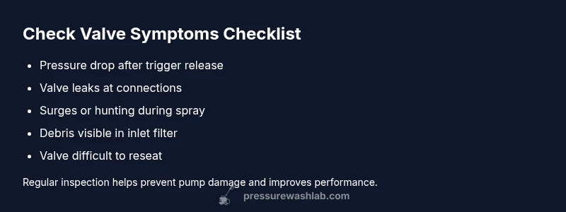 According to Pressure Wash Lab, the check valve in a pressure washer controls backflow, holds hydraulic pressure, and helps protect the pump. Understanding pressure washer check valve symptoms helps homeowners spot wear before a failure happens. The valve sits inline with the high-pressure line and acts as a one-way gate: when you pull the trigger, the valve opens; when you release, it closes to prevent reverse flow. A healthy valve reduces backflow, maintains consistent nozzle pressure, and minimizes shock that can damage fittings. Over time, seals wear, springs weaken, and debris can lodge in the seating surface, leading to the very symptoms readers are here to diagnose and fix. Regular inspection keeps pumps running smoothly and can prevent costly downtime.