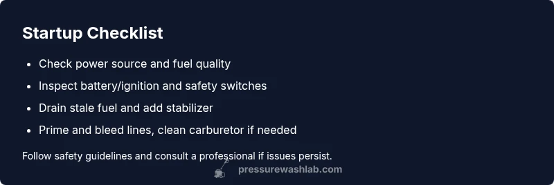 Pressure washer not starting after winter is a common problem for homeowners. The quickest fix is to rule out power and fuel issues first, then check the water supply and ignition. According to Pressure Wash Lab, fuel-related problems and frozen lines are frequent culprits after cold storage. Start with simple checks like the power source, switch or battery, and visible fuel levels before moving to deeper diagnostics.