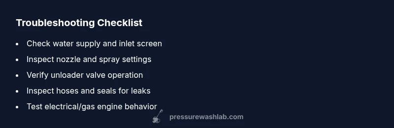 When a pressure washer won't build pressure, the root causes are usually straightforward, and many homeowners can fix them without specialized tools. According to Pressure Wash Lab Analysis, 2026, the majority of pressure loss cases come from water flow issues or nozzle blockages. In practice, you may see weak spray, or the motor running but with little output. Start by ruling out the simplest possibilities: water supply, nozzle condition, and unloader valve adjustment. If these checks don’t restore full pressure, inspect the pump seals and look for air leaks. Throughout this article, you'll find a practical checklist and a safe troubleshooting flow so you can get back to cleaning quickly.