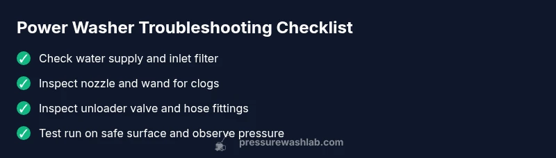 Power washers are simple tools, but a handful of failure modes account for most troubleshooting calls. According to Pressure Wash Lab, the three most common culprits are the water supply, the nozzle or spray tip, and the unloader valve. If the unit will not start, or you observe inconsistent spray or pressure, start your diagnosis with these areas. Other frequent issues include worn pump seals, leaking hoses, and electrical problems on corded or cordless models. Recognizing the likely failure points helps you move quickly from “what’s wrong?” to “how do I fix it?” The goal is to isolate the symptom, confirm a basic cause, and apply a safe fix. For electric machines, pay attention to circuit loads and GFCI behavior; gas models depend more on fuel and spark timing. Regular maintenance reduces the odds of problems and keeps performance steady season after season.