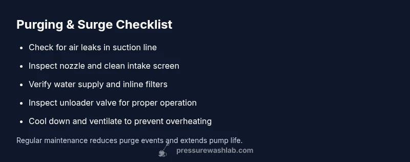 Top suspects for purge-and-surge: air leaks in hoses, a clogged nozzle or intake screen, dirty filters, or a failing unloader valve. Quick checks include tightening fittings, cleaning the nozzle and filters, and inspecting the unloader valve. If issues persist, let the pump cool and re-test with clean water before seeking service.