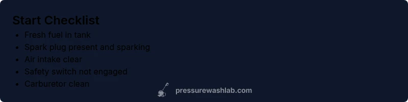 Most starts are due to fuel or ignition issues. Start by confirming fresh fuel, inspecting the spark plug, and ensuring the safety switch isn’t tripped. If unresolved, proceed with the diagnostic flow.