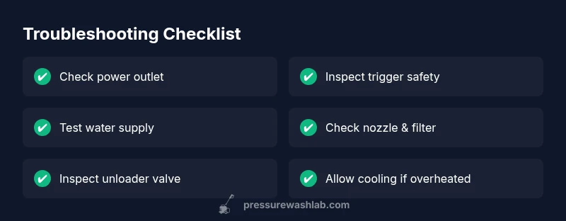 Common causes are a tripped breaker, faulty outlet, or a damaged cord. Verify power at the outlet, reset any GFCI, and inspect the cord for damage. If power checks pass but it still won’t start, move to water and safety checks.