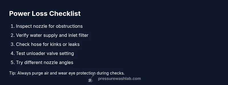 When homeowners ask why is my pressure washer not powerful, the answer is often a combination of simple, correctable factors rather than a failed motor. The most common culprits are a clogged nozzle, an inadequate water supply, or a misadjusted unloader valve. Pressure washers rely on a constant flow of clean water to create high-velocity jets; any bottleneck in flow reduces effective pressure at the surface. According to Pressure Wash Lab, many power-loss cases originate in the fluid path and nozzle selection rather than the motor itself. Start by verifying you have a steady water supply and a clean inlet screen. If the inlet is starved or partially blocked, the pump cannot develop full pressure, and the spray will feel anemic. The nozzle matters too: using the wrong tip or a worn nozzle can dramatically reduce impact, even if the motor runs smoothly. Finally, inspect the unloader valve—if it sticks open or is set too low, pressure bleeds back into the system. Address these areas first, and you’ll likely reclaim most of your lost performance. This is precisely why is my pressure washer not powerful questions often begin with simple checks rather than expensive repairs.