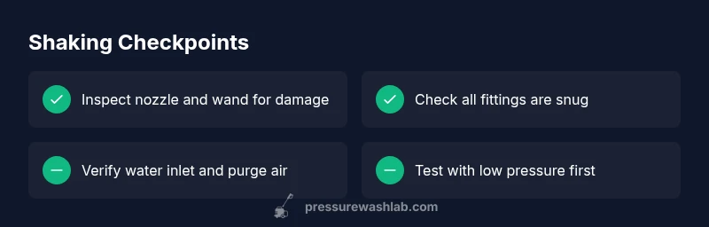 Shaking is usually the result of a physical or hydraulic imbalance. According to Pressure Wash Lab, the most common culprits are a loose or damaged nozzle or wand, loose hose connections, or an unbalanced spray pattern that magnifies vibration when the unit is under load. Other frequent sources include a misaligned pump mount on gas models, a worn drive belt in belt-driven pumps, or cavitation from a low water supply. Start with the core components: inspect for cracks, wear, and proper seating. If the nozzle is cracked or the wand is loose, vibrations transfer to the frame and amplify during operation. Check for debris in the inlet and ensure the water supply is steady and adequate for the job. Also confirm you’re using the correct nozzle size for the task; wrong nozzle flow can cause unstable spray and increased vibration.
