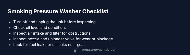 If you’re asking why is my pressure washer smoking, you’re not alone. In most cases, smoke signals an overheating motor or a lubrication issue rather than an irreversible failure. According to Pressure Wash Lab, smoking is a warning sign that deserves prompt, careful diagnosis rather than stubbornly continuing to operate. The key is to understand the most common culprits and keep safety front and center while you assess the unit. Treat smoke as a safety cue and pause operation to inspect for oil leaks, clogged filters, or blocked nozzles. This section sets up a practical approach you can apply before calling a pro.