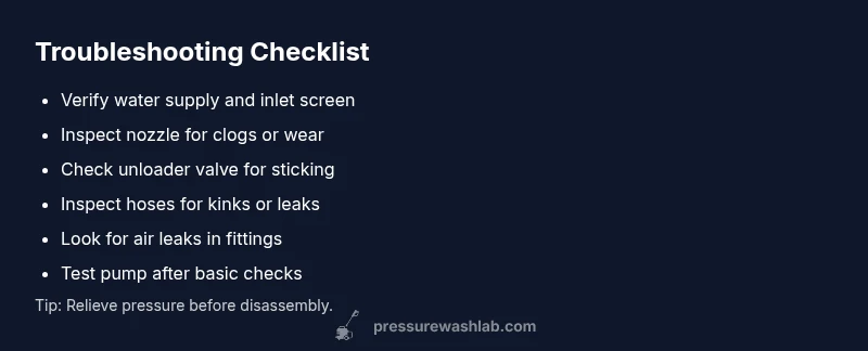 - Diagnosis path: Check nozzle and water supply → check trigger/wand → inspect unloader valve → inspect pump seals and internal components.